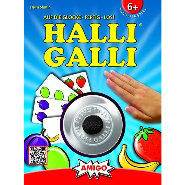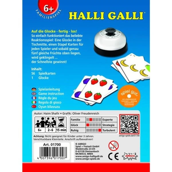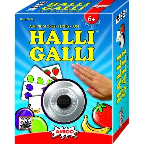 56 Karten, 5 Früchte, 1 Glocke. Da haben wir den Salat. Ein großer Obstsalat mit Bananen, Erdbeeren, Limonen und Pflaumen, das ist Halli Galli: Schnelligkeit und ein gutes Auge sind hier Trumpf. Reihum deckt jeder Spieler eine Karte auf. Sobald auf allen offenen Karten zusammen genau fünf Früchte einer Sorte liegen, gewinnt der Spieler, der zuerst klingelt, alle offenliegenden Ablagestapel. Wer am Ende die meisten Karten erklingelt hat, ist Sieger. Halli Galli ist einfach großer Spielspaß für Groß und Klein, setzt auf Reaktionsvermögen und Geschwindigkeit und schult nebenbei noch ein schnelles Auge. Es begeistert mittlerweile seit 25 Jahren Familien und Freunde.Art.-Nr.: 1353281