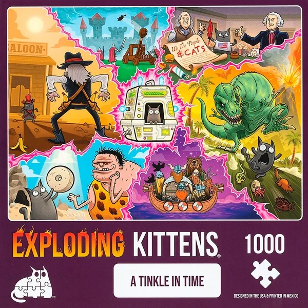 Die Puzzles aus der Welt der Exploding Kittens bieten herrlich verrückte Motive und großen Puzzlespaß. Die Motive sind katzenhafte Interpretationen besonderer Werke der Kunstgeschichte oder Charaktere aus dem Universum von Exploding Kittens. Die Puzzleteile bestehen zu 100% aus recyceltem Material. Das Puzzle A Tinkle in Time erzählt die Geschichte eines unerschrockenen Kätzchens und seines zeitreisenden Katzenklos.Art.-Nr.: 1901675