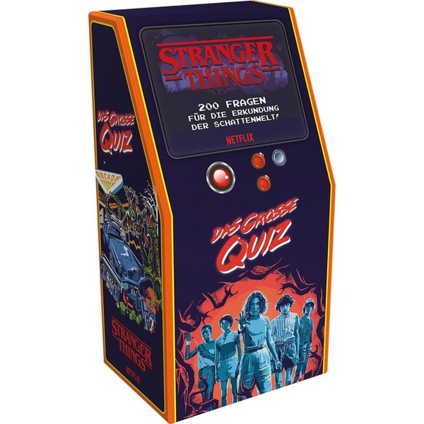 Bei Stranger Things: Das große Quiz treten bis zu acht Spieler gegeneinander an und testen ihr Wissen über die Netflix-Serie. Wer kennt die meisten Zitate, Momente und Anekdoten über die Schauspieler und ihre Charaktere? Fast 200 Fragen in drei Kategorien sind ein Test, wer sich in der Welt von Stranger Things am besten auskennt. Als zusätzlicher Hingucker kommt das Spiel in einer Schachtel in Form eines Arcade-Automaten.Art.-Nr.: 1864079
