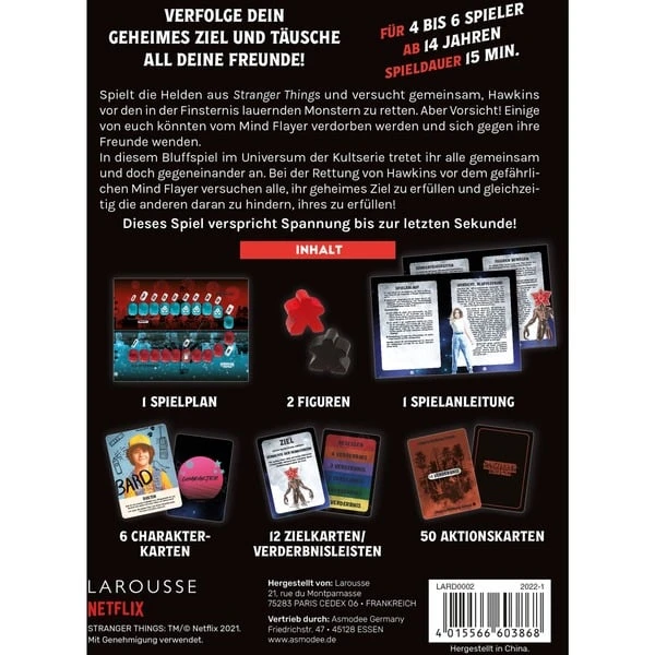 Stranger Things: Rettet Hawkins ist ein Bluffspiel mit geheimen Identitäten, das im Universum der erfolgreichen Netflix-Serie angesiedelt ist. Vier bis sechs Spieler schlüpfen in die Rollen der Serienhelden und arbeiten gemeinsam daran, Hawkins vor dem Angriff des Mind Flayers zu schützen. Allerdings verfolgt jeder auch noch ein geheimes Ziel und versucht seine Freunde daran zu hindern, ihres zu erfüllen. So ist nie wirklich bekannt, wem wirklich vertraut werden kann.Art.-Nr.: 1864080