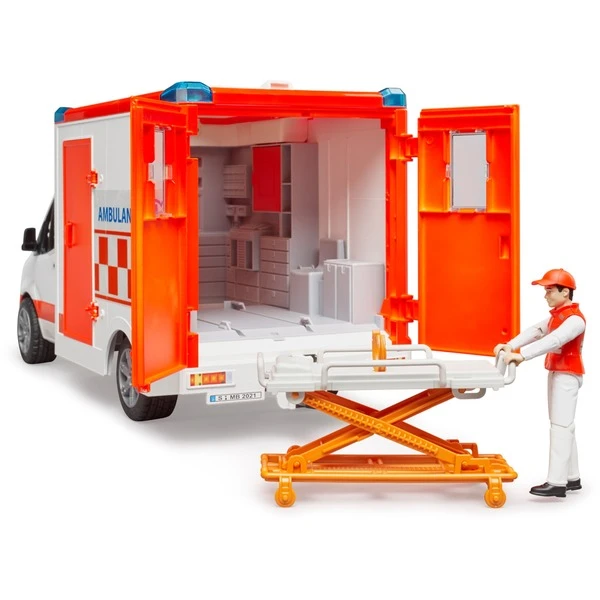 Zukunftsweisend, effizient, zuverlässig – so beschreibt Mercedes Benz den neuen Sprinter. Auch in der neuesten Generation bleibt er der vielseitige und allseits beliebte Transportprofi. Im umfangreichen Sortiment von BRUDER sind die neuesten Sprinter in unterschiedlichsten Varianten angekommen. Das Thema Einsatzfahrzeuge spielt bei der Firma Bruder eine wichtige Rolle. Zur Abrundung dieses Sortiments ist nun die neue MB Sprinter Ambulanz hinzugekommen. Wird ein Einsatz nachgespielt, so darf dieses, mit einer Vielzahl an Funktionen, ausgestattete Fahrzeug, nicht fehlen. Durch die zu öffnenden Türen steigt der im Lieferumfang enthaltene Sanitäter ins Fahrerhaus. Mit dem neuen, integrierten Light & Sound Modul mit verschiedenen Sirenensignalen und Leuchtfunktion kommt der Rettungswagen schnell und sicher zum Einsatzort. Durch die zu öffnenden Hecktüren und Seitentür, sowie das abnehmbare Dachmodul hat der kleine Sanitäter Zugang zum top modernen Behandlungsbereich. Auf der höhenverstellbaren Trage, die herausgezogen und wieder eingeschoben werden kann, findet jede bworld Figur für eine Behandlung Platz und kann sicher transportiert werden, ganz nach dem Bruder Motto – just like the real thing. Art.-Nr.: 1808297