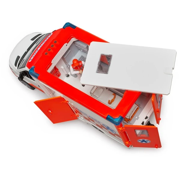 | Inhalt/Ausstattung | Fahrzeug mit Türen zum Öffnen, 2 Hecktüren mit einem Öffnungswinkel bis 270°, Light & Sound Modul, Trage zum Einschieben und Herausziehen, abnehmbares Dachmodul zum Bespielen von oben, Sanitäter mit Cappie | ||