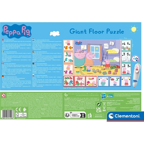 Mit diesem großen Puzzle kommt nach dem Zusammensetzen der Teile der Rätselspaß: Mit dem beiliegenden interaktiven Stift können dann Quizfragen zu Formen, Zahlen, Farben und logischen Verbindungen gelöst werden. Ist die Antwort richtig, leuchtet der Stift auf und macht einen lustigen Soundeffekt. Das aufgebaute Puzzle mit den Helden aus der Welt von Peppa Wutz ist 98 x 67,5 cm groß.Art.-Nr.: 1914847
