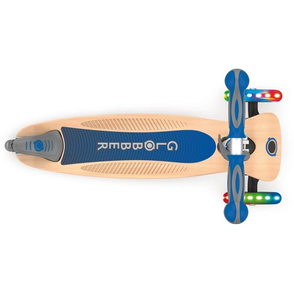 Der Primo Foldable Wood mit neuem Designkonzept bietet jede Menge Fahrspaß und ermöglicht einfaches Zusammenklappen. Der Lenker ist 3-fach höhenverstellbar zur optimalen Anpassung an das Kind. Durch die zuschaltbare Lenkeinrastung und die ergonomischen Handgriffe lässt sich einfach und sicher Fahren lernen. Ein weiteres Feature des Rollers sind die extra breiten Leuchtrollen. Das stabile Deck aus Birkenholz ist tiefer gelegt, so können leichter beide Füße aufgestellt werden. Das sorgt für optimale Kontrolle und erhöhten Komfort. Das Fahrwerk mit Kugellager ABEC 5 dient der optimalen Steuerung. Der Foldable Wood verfügt außerdem über eine besonders breite Hi-impact Reibungsbremse mit Speichenschutz sowie über super High Rebound gegossene PU Rollen in 120 mm und 80 mm.