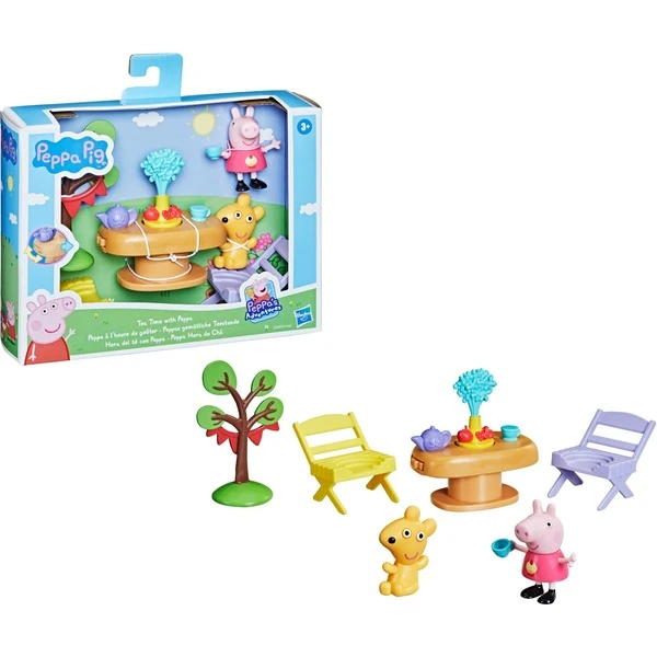 Wie wäre es mit einer Tasse Tee? Sogar Peppas Teddy hat Ja gesagt, denn das Set Peppas gemütliche Teestunde enthält alles, um eine wundervolle Teeparty für Peppa und ihren Freund zu veranstalten. Das Set ist von der beliebten Trickfilmserie Peppa Pig inspiriert und enthält eine 7,5 cm große Peppa Figur in einem niedlichen Kleid mit Cupcake-Design. Ebenfalls enthalten sind Peppas Teddybär (der Ehrengast), ein mit einer Girlande dekorierter Baum, 2 Stühle und ein spezieller Tisch mit einem Rädchen. Sobald das Rädchen von Kinderhand gedreht wird, fährt eine Etagere aus der Tischmitte heraus und enthüllt Sandwiches und Cupcakes! Vorschüler und Peppa Fans ab 3 Jahren werden viel Spaß dabei haben, mit diesem süßen Set die tollsten Teepartys zu veranstalten.Art.-Nr.: 1771797