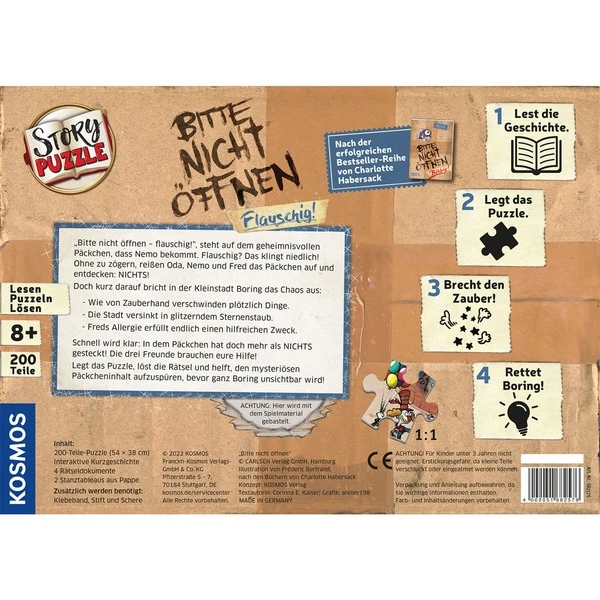 In der Kleinstadt Boring ist ganz im Gegensatz zu ihrem Namen immer etwas los! Nemo und seine Freunde Oda und Fred erleben immer wieder neue Abenteuer. Und die Spielerinnen und Spieler sind dabei: Sie tauchen ein in eine exklusive Kurzgeschichte aus der Bestseller Kinderbuch-Reihe „Bitte nicht öffnen“. Dann wird gepuzzelt: Auf dem fertig zusammen gelegten Wimmelbild-Puzzle sind viele kleine Rätsel und Suchspiele versteckt. Kurze Begleittexte führen von einer Aufgabe zur nächsten und treiben so die Story voran. Das Abenteuer geht weiter und wird interaktiv erlebbar.