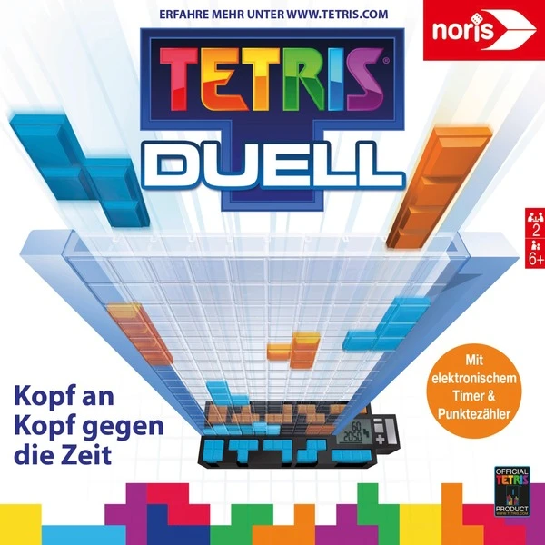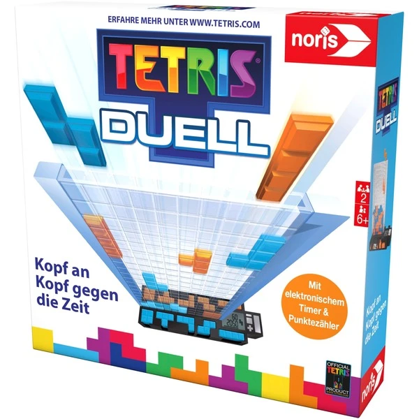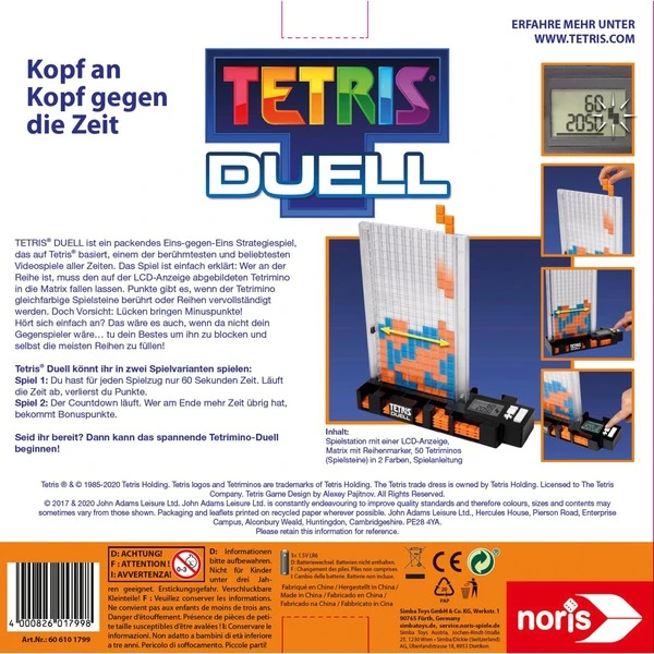 Tetris Duell ist ein packendes Eins-gegen-Eins Strategiespiel, das auf Tetris basiert, einem der berühmtesten und beliebtesten Videospiele aller Zeiten. Das Spiel ist einfach erklärt: Wer an der Reihe ist, muss den auf der LCD-Anzeige abgebildeten Tetrimino in die Matrix fallen lassen. Punkte gibt es, wenn der Tetrimino gleichfarbige Spielsteine berührt oder Reihen vervollständigt werden. Doch Vorsicht: Lücken bringen Minuspunkte! Hört sich einfach an? Das wäre es auch, wenn da nicht dein Gegenspieler wäre… tu dein Bestes um ihn zu blocken und selbst die meisten Reihen zu füllen!Art.-Nr.: 1652165