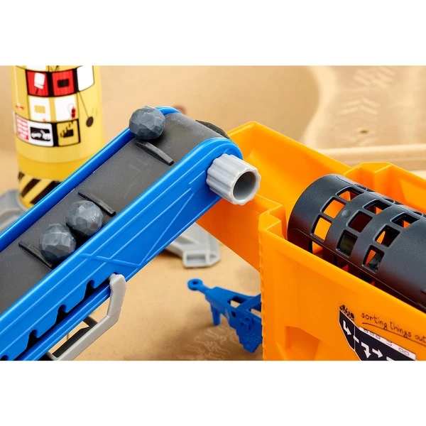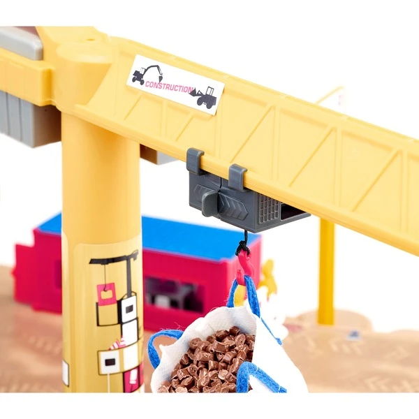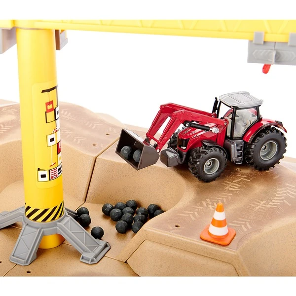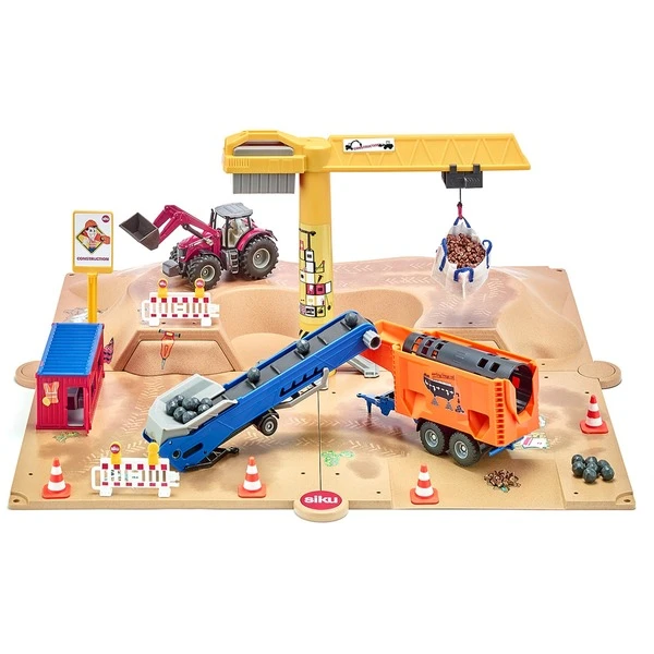 | Inhalt/Ausstattung | vier Grundplatten, ein Baucontainer, Absperrungen, ein Kran mit schwenkbarem Ausleger und beweglicher Laufkatze, ein bewegliches Förderband und ein Traktor. | ||