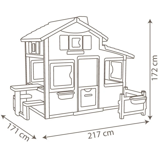 | Inhalt/Ausstattung | Spielhaus mit Picknicktisch, 2 Sitzbänken, geteilte Tür, drehbarer Fensterladen, elektronische Türklingel (batteriebetrieben) | ||