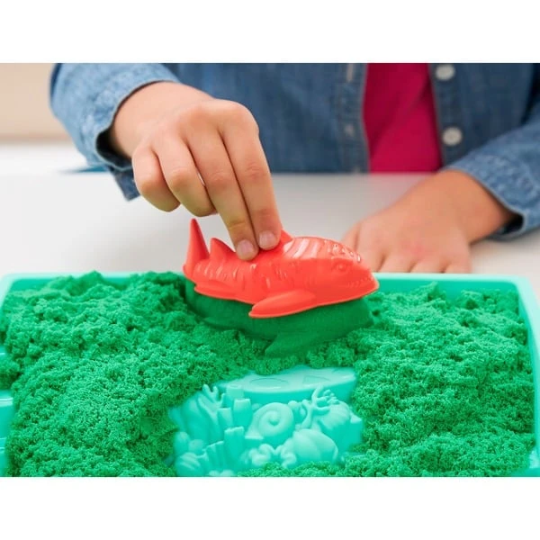 Mit Kinetic Sand eröffnet sich eine kreative und fantasievolle Sandspielwelt für drinnen: Dieser Spielsand ist formbar und faszinierend, gleitet durch die Hände und trocknet niemals aus, so dass er jederzeit spielbereit ist. Da Kinetic Sand an sich selbst haftet, bleiben die Hände sauber und auch das Aufräumen ist schnell erledigt. In diesem Set sind insgesamt 454 Gramm Sand in der Farbe grün enthalten. Hinzu kommen eine Sandbox mit verschiedenen Ebenen und drei Förmchen: Mit Hai, Schildkröte, einem kleinen Schloss und der Muschelschaufel lassen sich niedliche kleine Unterwasserwelten gestalten. Art.-Nr.: 100007973