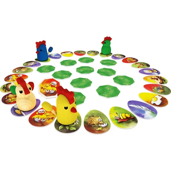 Der Hühnerhof besteht aus 24 eiförmigen Wegplättchen, die kreisförmig um die 12 verdeckten Hühnerhofplättchen gelegt werden. Die dickbauchigen Hühner starten, mit je einer hölzernen Feder ausgestattet, auf unterschiedlichen Wegplättchen. Ziel des Spiels ist es, sich mit den Federn der anderen Hühner zu schmücken. Die rasante Hühnergedächtnisrallye ist ein Klassiker, der nicht nur Kinder hellauf begeistert.Art.-Nr.: 1195365